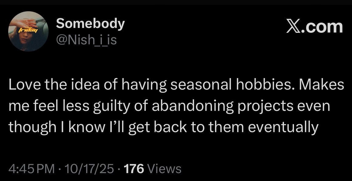 There might be intelligence in stopping. Or recognizing when continuing would turn something you loved into a chore. In choosing not to force an idea into a shape it’s resisting just because you think you should complete it. Maybe some projects exist to teach your hands something new. I’ve been trying to teach myself how to crochet for years and perhaps, one day, it won’t make me feel like my hands don’t belong to me. But if not, maybe it solely exists to show what doesn’t fit—so I can find what does.